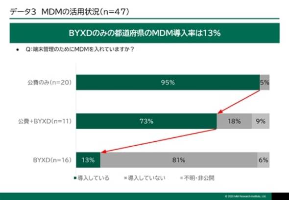 保護者負担型の端末整備については、端末の運用を集中管理するMDM(モバイル・デバイス・マネジメント)の導入率に大きな差が生じている。MDMの導入率は「公費のみ」が95%、「公費+BYXD(BYODとBYADの総称)」が75%である一方、「BYXDのみ」では13%にとどまった。