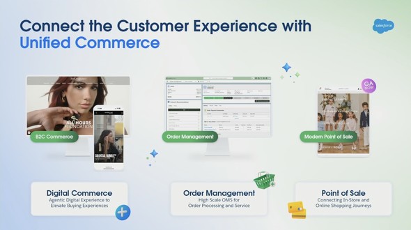 もう1つは、ECプラットフォーム「Commerce Cloud」自体が進化したことだ。2016年に買収したEコマース大手・Demandwareのシステムを前身とする「コマース」に、Salesforceが独自に開発した「オーダーマネジメントシステム」(OMS)、そして2024年9月のPredictSpring買収を経て、店舗向けの製品「POS」が組み込まれ、3本柱でユニファイドコマースのためのCommerce Cloudを提供できるようになった。