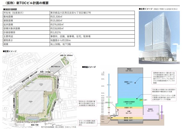 卸売業者が数多く入居するビルとして知られる五反田のTOCビルは1970年に竣工。地下3階、地上13階建ての横に広いビルで、オフィスや飲食店、小売店も入居している。