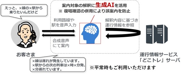地方エリアの在来線を中心に展開している、運行情報サービス「どこトレ」を活用する。どこトレを展開している全路線で導入し、利用者がガイダンスに従って路線や駅を音声入力すると、AIが遅延や運休などの状況、各駅の発車時刻、列車の現在位置などを案内する仕組みだ。AIがどこトレを参照することで、スムーズで正確な情報提供を実現した。