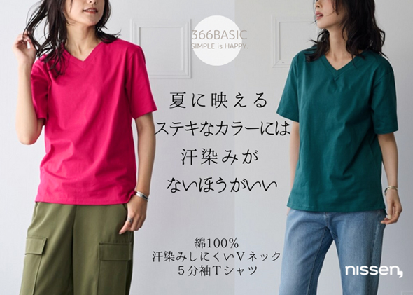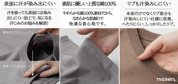 ニッセンは2025年、新作2アイテムを追加した。いずれのアイテムも、本体に加えて襟のリブ部分にも汗染み対策を施し、洗濯を重ねても型崩れしにくい設計になっている。