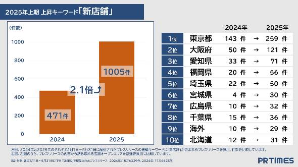 8位の「新店舗」は、前年比約2.1倍の1005件と、過去最多となった。都市部の再開発や地方都市での施設刷新、インバウンド需要の高まりなどが背景にある。