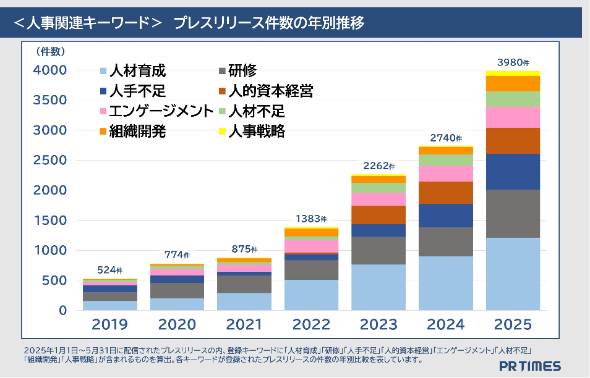 年々増加傾向にあるキーワードについては、「人材育成」「研修」「組織開発」など、人を育てる取り組みや人事に関連した件数が伸びている。特に「研修」は2024年が482件、2025年は799件と、前年と比べて1.6倍以上に伸びている。