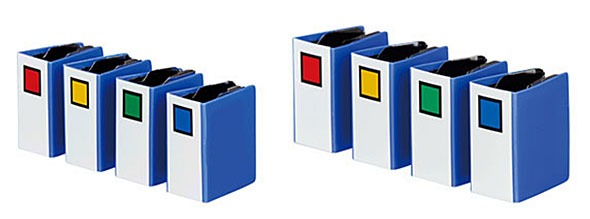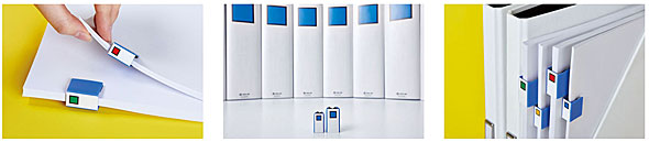 キングファイルは、オフィスや学校などで使われている定番のファイルだ。特徴的なのは背表紙のデザインで、青・緑・赤・黄の4色の正方形が並んでいる。ミニクリップにもこの4色を取り入れており、書類やメモを色別に分類しやすくなっている。