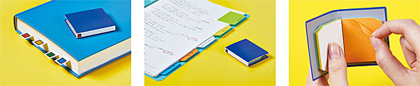 もう1つのアイテムが「キングファイルふせん」(550円〜)である。見た目は小さなキングファイルそのもので、中にふせんが収納されている。ふせんのタイプは、「背見出しタイプ」と「インデックスタイプ」の2種類を用意した。