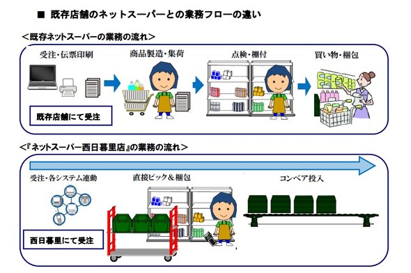 イトーヨーカドーは2001年に葛西店で店舗出荷型のサービスを開始した。北海道、東北、関東、関西など、店舗付近で対応し、店舗数の拡大に伴い、売り上げが伸びている。2015年には、ネットスーパー専用店舗として西日暮里店を出店した。同店は一見すると通常店舗に見えるが、一般客は中に入れない。出荷件数は1日2000件と既存店の5倍の能力だ。