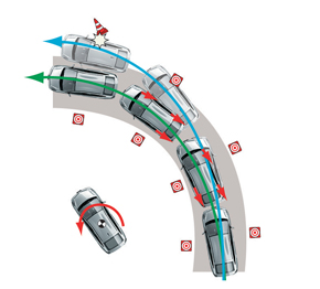 ESC作動の例。左の図はカーブを曲がり切れないアンダーステア状態(旋回Gよりステアリング舵角が大きい)と判断して、左後輪に強くブレーキをかけ旋回Gを高めると同時に右側前後輪にも弱くブレーキをかけて車速を落とす制御を行い軌道を回復させる例。右の図はオーバーステア状態(ステアリング舵角より旋回Gが大きい)を検知して、右側前輪のブレーキだけを作動させて旋回Gを打ち消してスピンモードを防ぐように働く(写真:ボッシュ)クルマの速度や、旋回方向の角加速度、ステアリング舵角、エンジン回転や変速機のギア位置などを常に検知。クルマの姿勢が不安定と判断すると、エンジン回転を抑えると同時に4輪のブレーキを独立制御する。これにより車両の姿勢を安定させる。