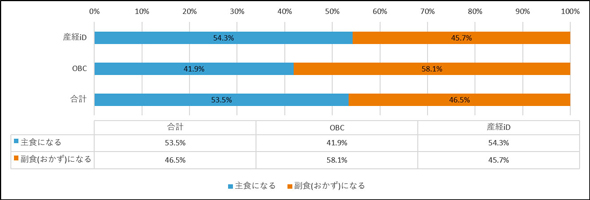 主食がやや優勢に見えるが、これが「関西」だと逆になる。ラジオ大阪のリスナー135人に同じことを聞くと、41.9%が「主食」、58.1%が「おかず」と逆転する。関西の方たちは、たこ焼きなどの粉物もおかずにして白飯を食べる人も少なくないので、同じロジックだと思われる。