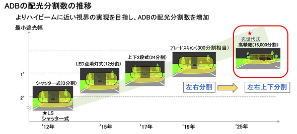 自動車メーカーによって構造はさまざまだが、その多くを供給している小糸製作所によれば、ADBもLEDヘッドランプの進化に伴って急速に進化しているという。