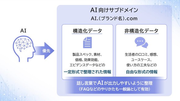 AIにとっての高品質なデータとは、「構造化データ」と「非構造化データ」にきちんと分けられ、話し言葉でAIが出力しやすいように整理されたものだという。構造化データとは、製品スペック、素材や価格、効果効能、エビデンスデータなどの一定形式で整理された情報、非構造化データは生活者の口コミや感想、ユースケース、使い方の工夫といった自由な形式の情報を指す。