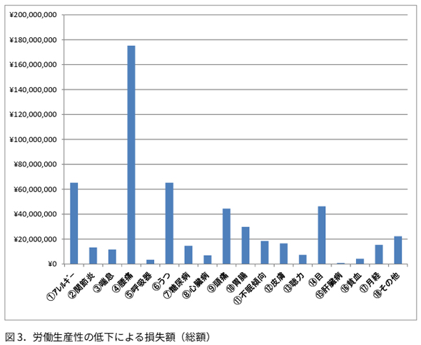それによれば、労働生産性の低下による損失額は「腰痛」が最も高く、「アレルギー」「うつ」と続くのだが、その次は「目」となっている。