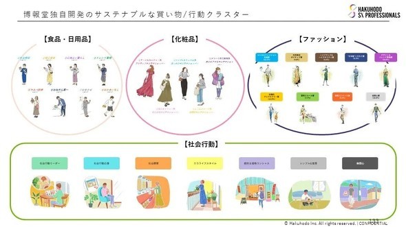 SDGs認知、社会購買に関する経験、社会行動全般に対する実践度などを聴取し、「食料・日用品」「化粧品」「ファッション」それぞれのジャンルでのクラスターを抽出しています。