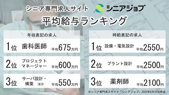 50歳以上に特化した求人サイト「シニアジョブ」を運営するシニアジョブ(東京都新宿区)は、同サイトに掲載された求人の平均給与を職種ごとにまとめ、平均年収・平均日給・平均時給ごとにトップ10を発表した。平均年収が最も高いのは、「歯科医師」(675万円)だった。