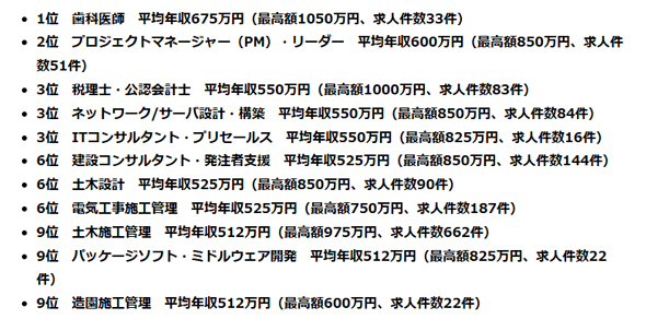 平均年収ランキングの2位は「プロジェクトマネージャー(PM)・リーダー」(平均年収600万円)、以下「ネットワーク/サーバ設計・構築」「税理士・公認会計士」「ITコンサルタント・プリセールス」(いずれも同550万円)、「建設コンサルタント・発注者支援」「土木設計」「電気工事施工管理」(いずれも同525万円)という結果に。