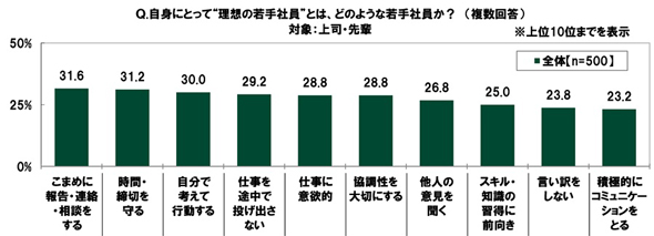 30〜69歳のビジネスパーソンに「理想の若手社員」を聞くと、「こまめに報告・連絡・相談をする」(31.6%)が最も多かった。以下「時間・締切を守る」(31.2%)、「自分で考えて行動する」(30.0%)、「仕事を途中で投げ出さない」(29.2%)、「仕事に意欲的」「協調性を大切にする」(いずれも28.8%)だった。