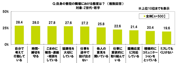 18〜29歳のビジネスパーソンに「自身の普段の職場における態度」を聞くと、最も多いのは「自分で考えて行動している」(28.4%)。以下「時間・締切を守る」(28.0%)、「こまめに報告・連絡・相談をしている」(27.8%)、「協調性を大切にしている」(27.6%)、「仕事を途中で投げ出さない」(27.2%)が続いた。