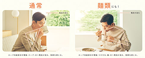 いずれも微弱な電流を食品に流し、塩味やうま味を増強する仕組み。明治大学総合数理学部先端メディアサイエンス学科の宮下芳明研究室との共同研究によって開発した、減塩食品の塩味を約1.5倍に増強させる独自の電流波形の技術を搭載した。
