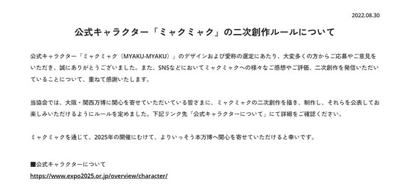 ファンによるミャクミャクの二次創作が盛り上がった際、大阪・関西万博の主催者はそれを厳しく取り締まらず、公式サイトで感謝の気持ちを伝えました。そして、大阪・関西万博に関心を寄せる生活者に向けて、二次創作を公表して楽しめるようルールを制定しました。