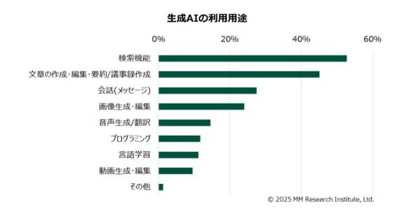 生成AIの利用用途については、「検索機能」(52.8%)と回答した人が最も多く、次いで「文章の作成・編集・要約/議事録作成」(45.1%)、「会話(メッセージ)」(27.5%)が続いた。