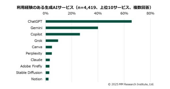 利用経験のある生成AIサービスについては、OpenAIの「ChatGPT」(65.7%)が最も多かった。次いで米グーグル「Gemini」(40.0%)、米マイクロソフト「Copilot」(26.2%)となった。
