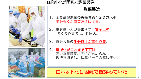 大手コンビニやスーパーから総菜製造の委託を受けている食品製造業など「中食」にかかわる企業の業界団体「日本惣菜協会」の資料によれば、全食品製造業の労働者約120万人中、半分近くが総菜製造に従事している。しかし、低賃金重労働に嫌気がさしている日本人労働者がほとんど集まらない。かといって、採算が取れないので機械化の導入も進んでいない。その結果、総菜製造現場の「現実」は以下のようになっている。