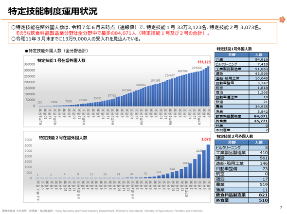 特定技能在留外国人数は、令和7年6月末時点(速報値)で、特定技能1号33万3123名、特定技能2号3073名。外国人労働者のうち、飲食料品製造業分野は全分野中で最多の8万4071人、令和11年3月末までに13万9000人の受入れを見込んでいる。