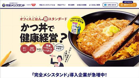 現在、日清食品の社員食堂で「完全メシ」のメニューを日替わりで提供しているが、他企業にも「完全メシ食堂」のサービス名で展開している。また、「完全メシ」が入った専用の冷凍ショーケースを社内に設置する「完全メシスタンド」というサービスも始めている。導入企業は増えており、ニーズの高さを感じているようだ。