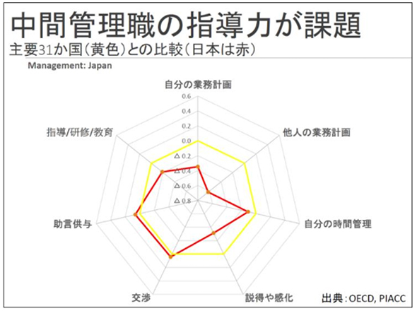 報告書には、OECD(経済協力開発機構)のデータをもとにして、主要31カ国の管理職の指導力を比較したグラフがある。それを見ると、日本の中間管理職は「説得や感化」「他人の業務計画」「自分の業務計画」という能力が31カ国平均に比べてガクンと落ち込む。