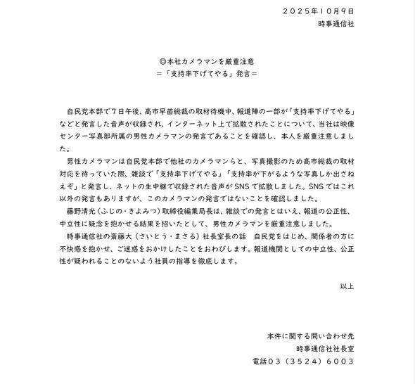 10月9日、時事通信社は公式サイトで事実を認めました。「雑談での発言とはいえ、公正性・中立性に疑念を抱かせる結果を招いた」として、発言者を厳重注意処分に。さらに、編集局長名で再発防止策の徹底と謝罪を発表しました。