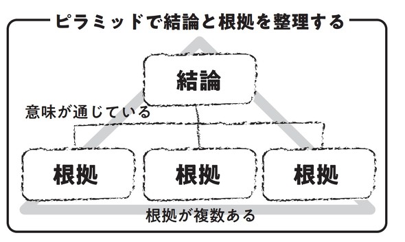初めて聞く方のために簡単に説明すると、話には結論と根拠があり、ピラミッドストラクチャーとは、その結論を一番上に、根拠をその下に並べたものです。根拠は複数あることが多いので、並べてみると三角形、つまり、ピラミッドのような形になります。これを、ピラミッドストラクチャーといいます。