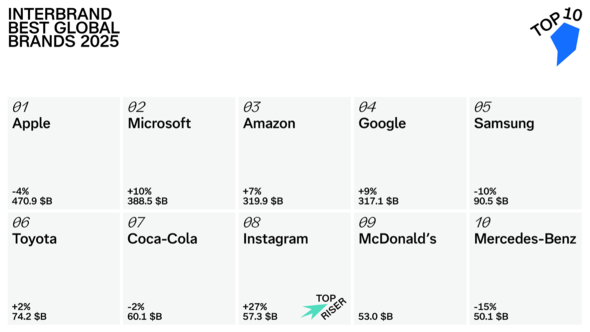 ランキングの4位以下は「Google」「Samsung」「Toyota」「Coca-Cola」「Instagram」「McDonald’s」「Mercedes-Benz」と続いた。