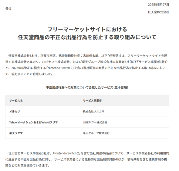 加えて、メルカリが外部圧力によってようやく動いたと感じさせている点も、ネガティブな印象を与える。任天堂は5月、Nintendo Switch 2の発売に先がけて、メルカリとLINEヤフー(Yahoo!オークションとYahoo!フリマ)、楽天グループ(楽天ラクマ)と、不正出品行為への対策について合意していた。