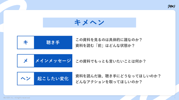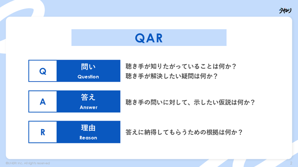 私が多用しているのは「キメヘン」というフレームです。これによって「誰に」「何を」「どう変化してほしいか」が明確になります。さらに「QAR(Question、Answer、Reason)」という考え方も重要です。これは、聞き手の疑問(Question)に対して答え(Answer)を提示し、その理由(Reason)を添えるものです。