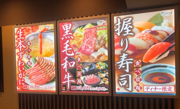 メニューも通常店舗とは異なるラインアップとなっている。黒毛和牛食べ放題コース(平日ランチ3849円、平日ディナー4509円)や、生本ずわいがに食べ放題コース(平日ランチ1万2539円、平日ディナー1万3199円)をレギュラーメニューとして提供しており、特に黒毛和牛コースが人気だという。