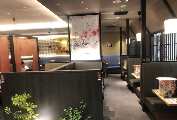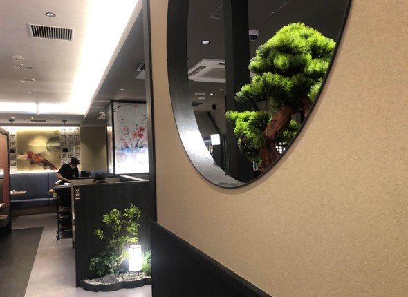 まず挙げられるのは、和を強調した内装だ。コンセプトは“京町家料亭”で、瓦屋根風の外観や京染めののれん、黒と白を基調にした落ち着いたインテリアなど、日本文化を感じられる空間となっている。店内にはコイや梅の花をあしらった絵画や盆栽などが飾られており、日本らしさを演出している。