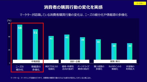 マーケターを対象に、現在認識している消費者購買行動の変化を聞くと、「ニーズの細分化」(58%)、「情報源の多様化」(51%)、「検討プロセスの短縮化」(41%)という回答が多かった。