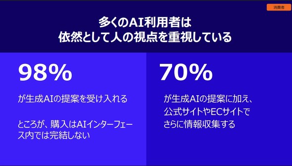昨今、買い物をする際に生成AIを活用する消費者が増加している。同社の調査では、消費者の98%が生成AIの提案を受け入れている一方で、そのうち70%は「生成AIの提案に加え、公式サイトやECサイトでさらに情報収集をする」と回答。生成AIのみに頼って買い物をしている消費者は少ないことが分かった。