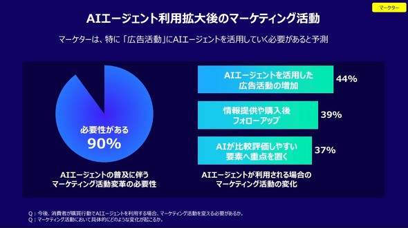 今後、消費者が買い物時にAIエージェントを利用する場合、「マーケティング活動を変える必要がある」と回答したマーケターが90%に上った。具体的には「AIエージェントを活用した広告活動の増加」(44%)、「情報提供や購入後フォローアップ」(39%)、「AIが比較評価しやすい要素へ重点を置く」(37%)という回答が多く見られた。