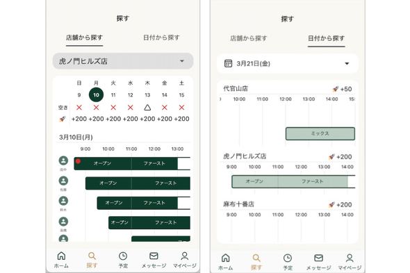 こうした課題を踏まえ、CRISPでは2022年12月に自社開発の勤怠・エンゲージメント管理アプリ「クリスプワークプレイス」を導入した。スタッフはアプリから全店舗の空きシフトを確認し、希望する時間帯や店舗を自由に選んで勤務できる。例えば、所属店舗の金曜シフトが埋まっていても、隣の店舗に空きがあればそこで勤務できるそうだ。