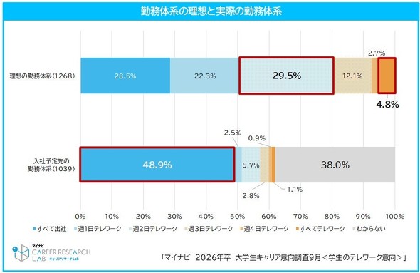 マイナビが2026年卒業予定の学生を対象に実施した調査で、フルリモート勤務を希望する学生は4.8%にとどまったことが分かった。