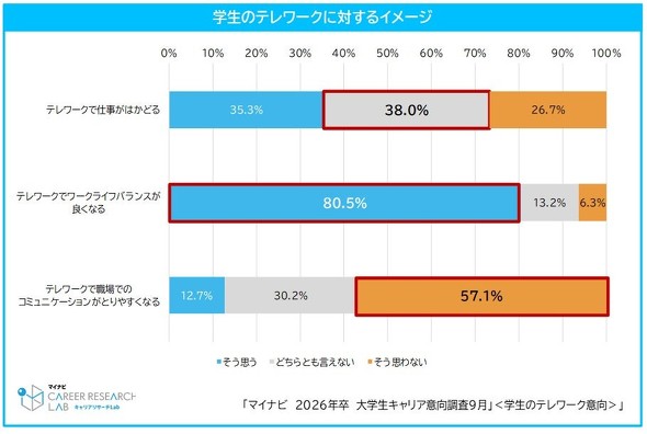 テレワークに対するイメージでは、「ワークライフバランスが良くなる」と考える学生が80.5%に上った。一方で、「職場のコミュニケーションが取りやすくなる」と思う学生は少なく、「そう思わない」と回答した学生が57.1%を占めた。「テレワークで仕事がはかどる」かどうかについては、「どちらとも言えない」(38.0%)が最多で、意見が分かれた。