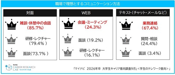 職場での理想のコミュニケーション方法については、対面では「雑談・休憩中の会話」(85.7%)、Webでは「会議・ミーティング」(24.3%)、テキストでは「業務連絡」(67.4%)が最も多かった。
