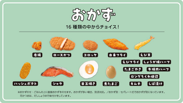 まずは、2025年5月から近畿エリアの一部店舗(合計18店舗)で順次、提供を開始した。最初のトライアルでは、6種類の「ごはん・容器」、16種類の「おかず」、8種類の「たれ」から選べるようにした。
