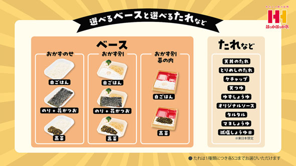 東日本エリアでの販売を機に、カスタマイズの種類を追加したほか、選べるおかずの種類も増やした。注文方法は、以下の2パターンとなる。
