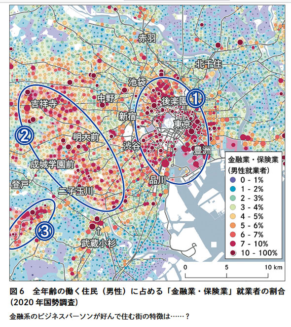 まず目に飛び込んでくるのが(1)都心・湾岸エリアです。金融系事業者の主要なオフィスが日本橋・大手町・丸の内に集中し、賃金水準も高いことから、職住近接を重視する人々は都心3区とその隣接地域に多く住んでいます。