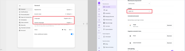 ChatGPTは「設定」→「一般」の、「言語」および「使用言語」から、Canvaは、画面左下の「設定」→「言語」から切り替えが可能だ。さらに、使用しているブラウザとPCの設定も変更しておこう。