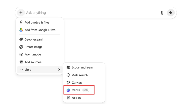 デザインを作成するときは、チャット入力欄左下の「+」→「More」→「Canva」を選んだ上で、作りたいものを具体的に指示する。
