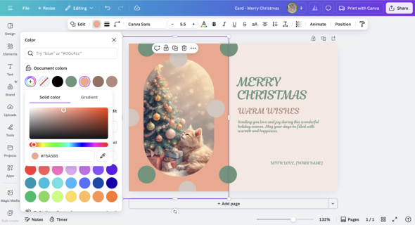 An elegant Christmas card in a warm, pastel art style. It features a cat and a Christmas tree, with the words "Merry Christmas," and space left at the bottom for a handwritten message.