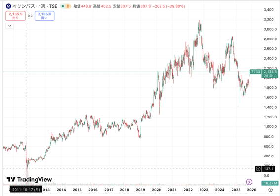 だが、同社は経営陣を刷新し、ソニーからの資本注入を受け入れ、強みである医療(内視鏡)事業への集中という事業再生を断行した。市場がこの「膿を出し切る」姿勢と、中核事業の圧倒的な競争力を再評価すると、株価は数年かけて事件前の水準を遥かに超え、不正発覚時の10倍近くまで株価は上昇した。