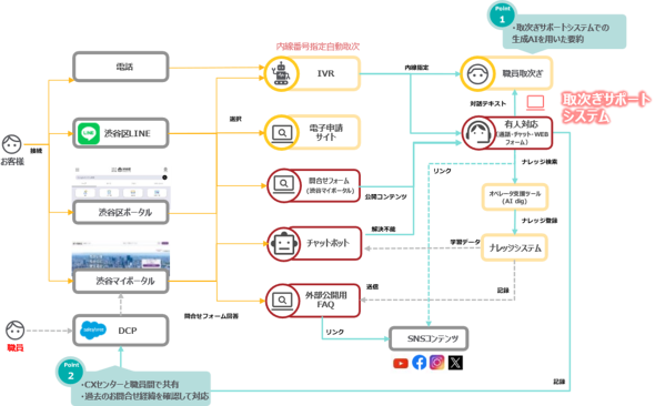 こうした状況を打開すべく、渋谷区は2024年1月から順次「デジタルコンタクトセンター」を構築。IVR(自動音声応答装置)の導入や、FAQサイトの更新、チャットbotやLINE相談窓口の導入、生成AIによる通話内容のテキストデータ化などで、段階的に運用の在り方を抜本的に見直していった。その中でも、特に力を入れて取り組んだのは、KCS(ナレッジ・センター・サービス)の導入、つまり「ナレッジの蓄積」だ。